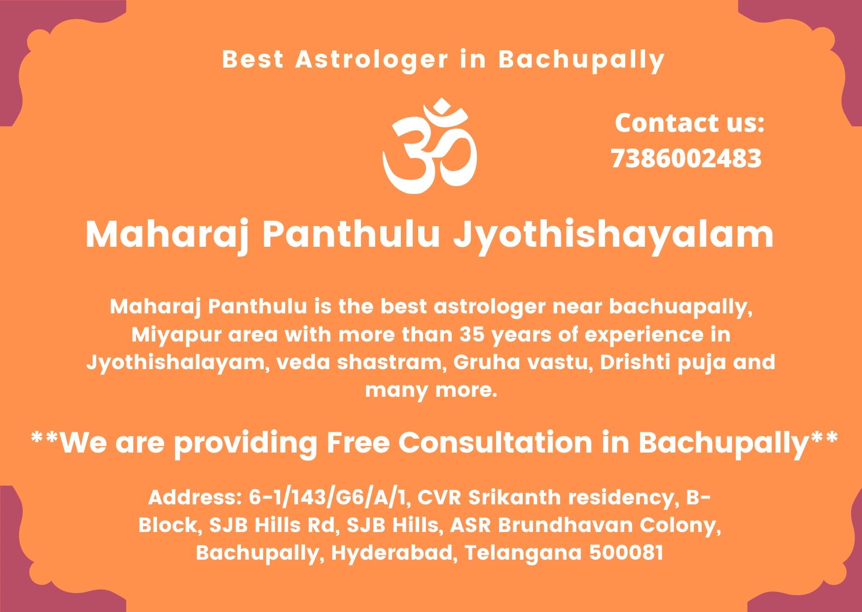 Maharaj Panthulu is the best astrologer near bachuapally, Miyapur area with more than 35 years of experience in Jyothishalayam, veda shastram, Gruha vastu, Drishti puja and many more. Contact us for any predictions, suggestions and counselling related to education, Career development, Business selection and growth, For